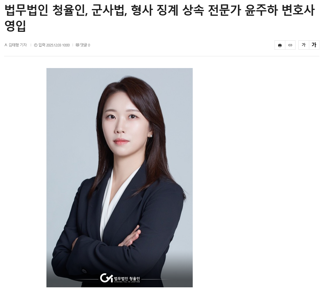 | Á¦¸ñ | ¹ý¹«¹ýÀΠûÀ²ÀÎ, ±º»ç¹ý, Çü»ç ¡°è »ó¼Ó Àü¹®°¡ À±ÁÖÇÏ º¯È£»ç ¿µÀÔ |