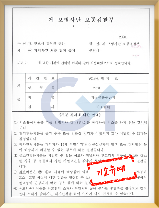 ÀÇ·ÚÀÎÀº °íÀǹüÀÎ ±º¿ë¹°Àýµµ¿¡¼­ °ú½Ç¹üÀÎ °ú½Ç±º¿ë¹°¼Õ±«ÁË·Î Á˸íÀÌ º¯°æ µÇ¾ú°í, ±º°ËÂû ´Ü°è¿¡¼­ ÂüÀÛ»çÀ¯¸¦ ÀÎÁ¤¹Þ¾Æ ±â¼ÒÀ¯¿¹ óºÐÀ» ¹ÞÀ» ¼ö ÀÖ¾ú½À´Ï´Ù.