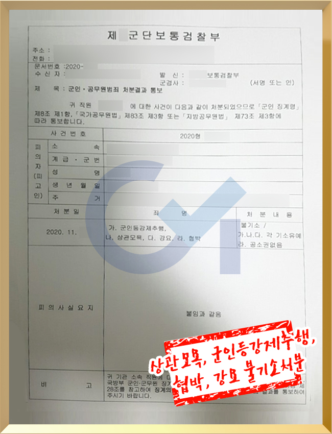 À§¿Í °°Àº ³ë·ÂÀÇ °á°ú·Î ±º °ËÂûÀº ÀÇ·ÚÀÎÀÇ ¹üÁË»ç½Ç(»ó°ü¸ð¿å, ±ºÀεî°Á¦ÃßÇà, Çù¹Ú, °¿ä µî)¿¡ ´ëÇØ ¡®ºÒ±â¼Ò(±â¼ÒÀ¯¿¹)¡¯ óºÐÀ̶ó´Â °¡Àå °ü´ëÇÑ Ã³ºÐÀ» ÇÏ¿´°í, ÀÇ·ÚÀÎ ¿ª½Ã ÀÚ½ÅÀÇ ¹üÁË»ç½Ç¿¡ ´ëÇÏ¿© ¹ÞÀ» ¼ö ÀÖ´Â ÃÖ¼±ÀÇ °á°ú¸¦ ¹ÞÀ» ¼ö ÀÖ¾ú½À´Ï´Ù.